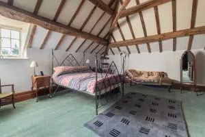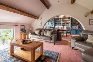 A particularly characterful feature of the house is the spacious library/sitting room with its wood-burning stove. Formerly a cheese room, this generous and versatile space could equally serve as a principal suite, studio, or an excellent informal living area.