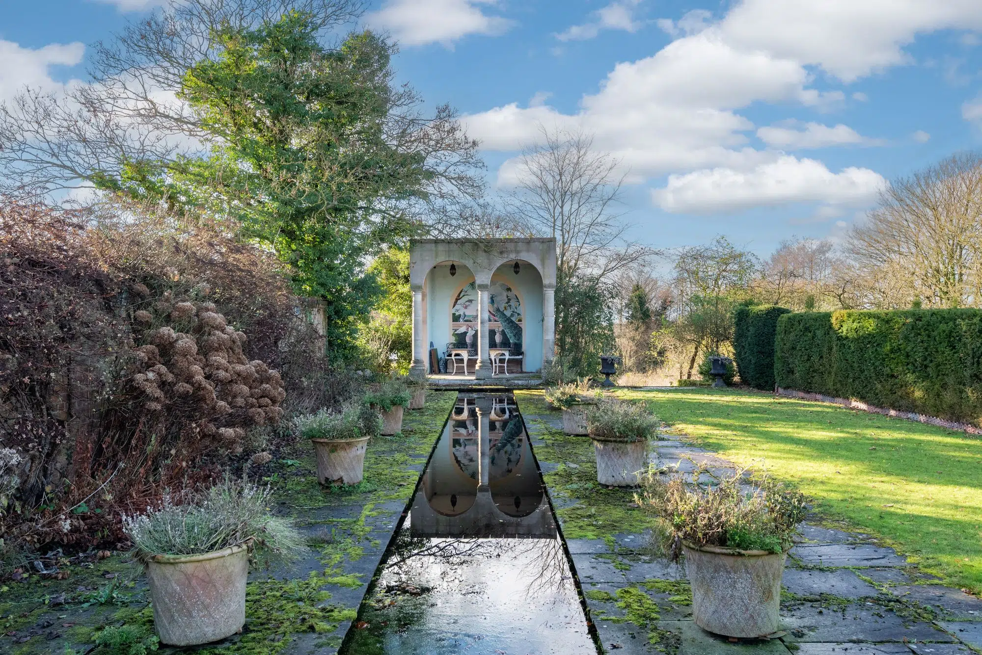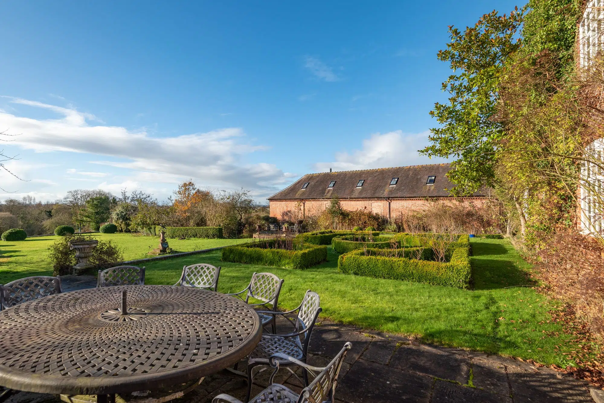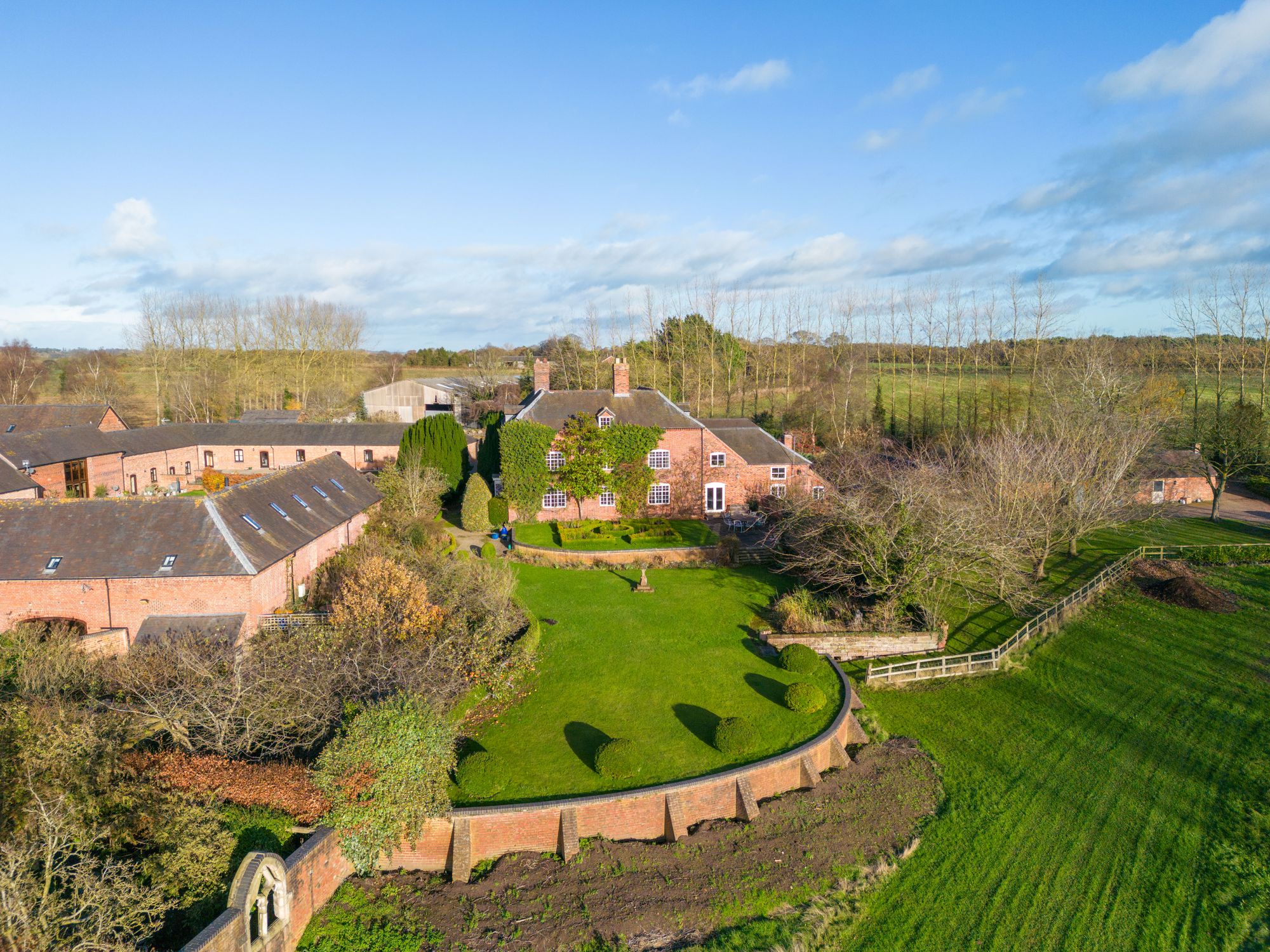 Dodecote Grange is approached within beautifully landscaped gardens which wrap around the house and have been thoughtfully designed to create a tranquil and picturesque setting. Sweeping lawns, mature trees and established planting provide colour, structure and privacy throughout the seasons.