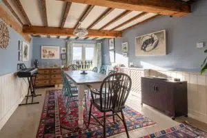 The property immediately reveals its period origins upon entering, with exposed ceiling beams enhancing many of the principal rooms and lending warmth and authenticity throughout. The impressive drawing room is particularly noteworthy, centred around a magnificent inglenook fireplace which forms a striking focal point and creates a wonderfully atmospheric space in which to gather.