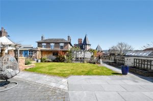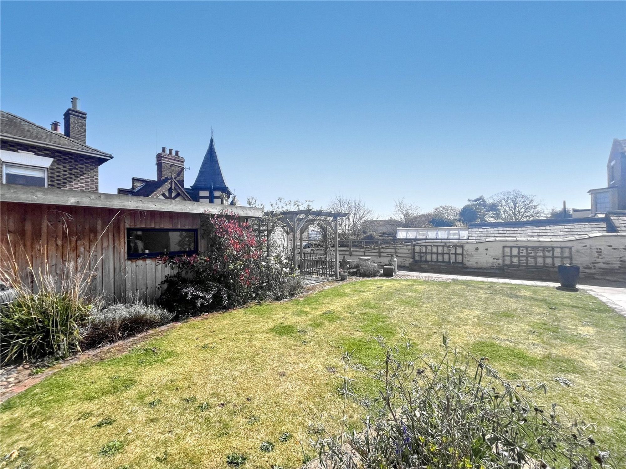 Externally, the property offers a superb family friendly garden which provides an excellent space for entertaining and a practical area for children to play. A large paved patio terrace steps out from the rear of the property and continues to a level lawn with raised flower beds and paved pathways. A versatile garden room is positioned to an excellent bbq area with pergola. There are useful stores/ sheds. Another particular feature is gated access directly onto the historic Castle Walk.