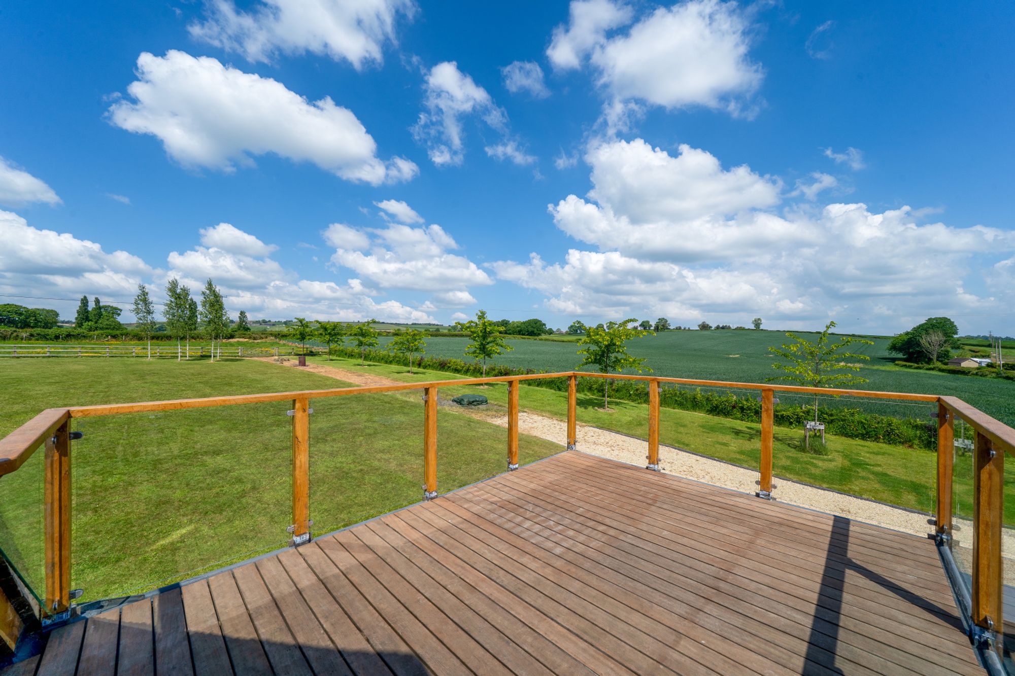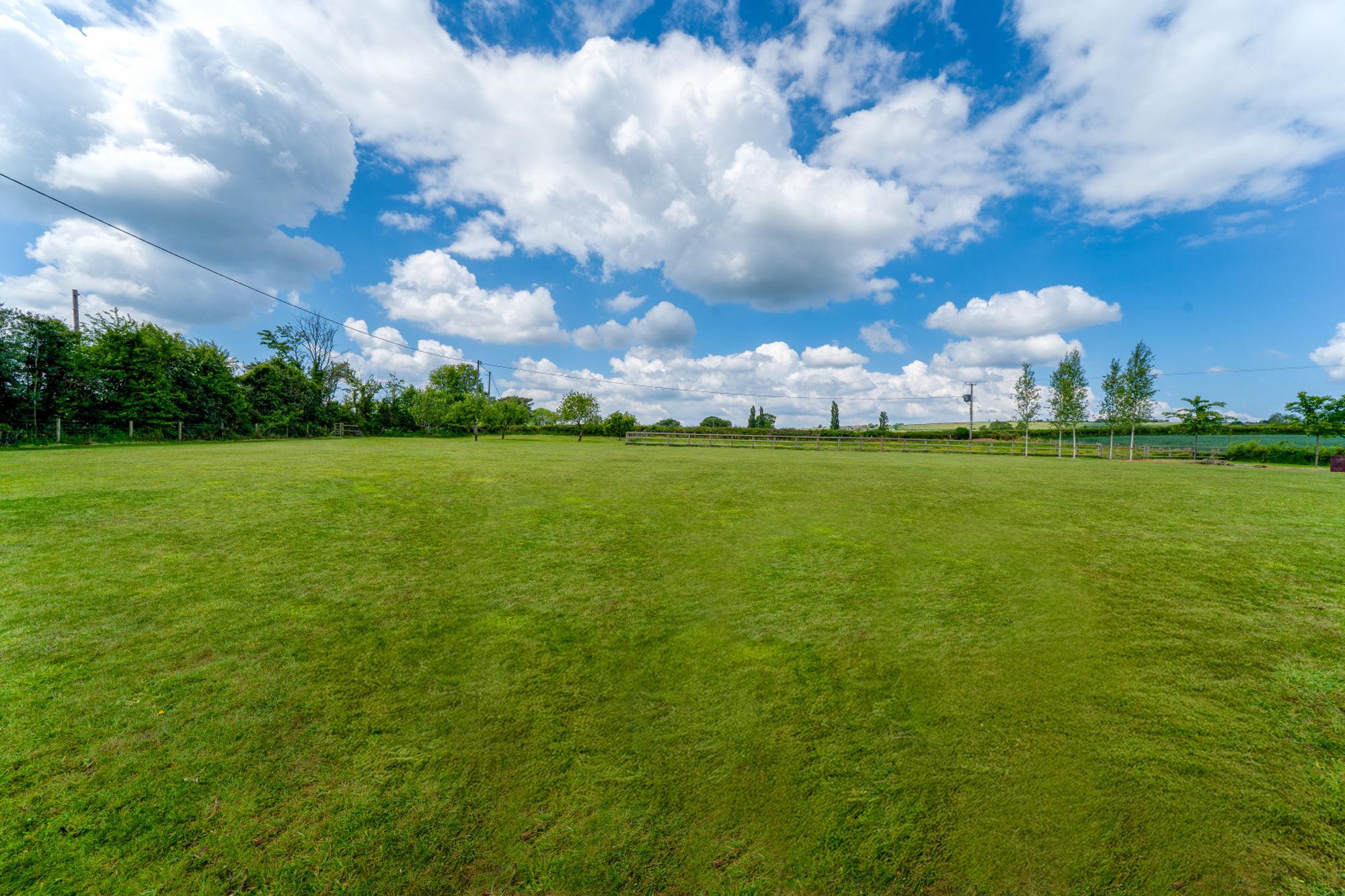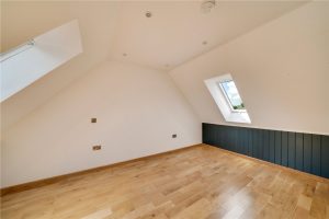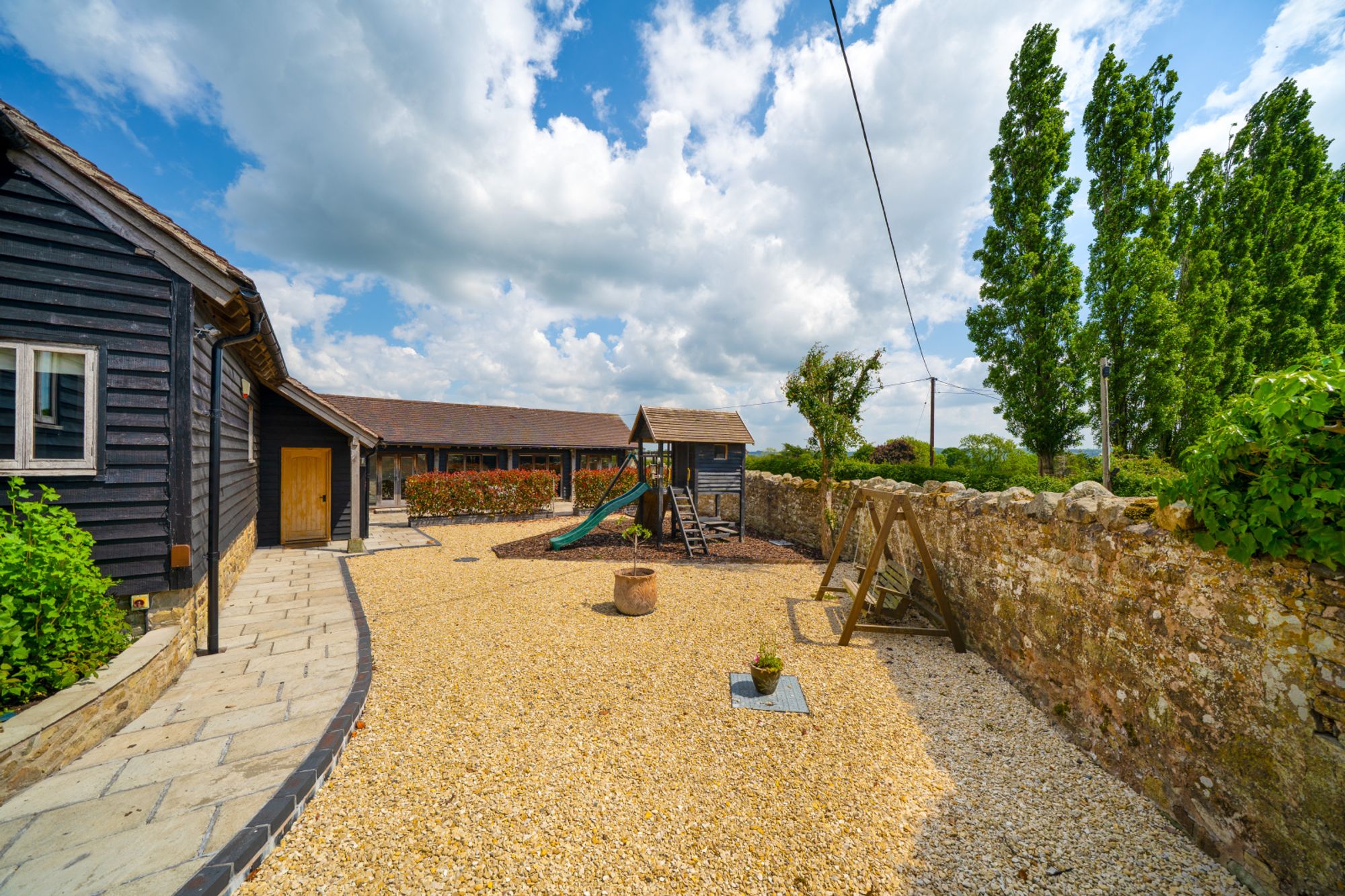 To the rear of the garden is a separate paddock/meadow which is enclosed by post-and-rail fencing. Immediately behind the house is a paved area offering a perfect space to sit and enjoy the rural views and for entertaining. This paved continues around to the front of the house which leads to a further gravelled area and children’s play area. The play area is bordered and filled with bark, offering a safe environment for children to play while remaining in close proximity to the house.