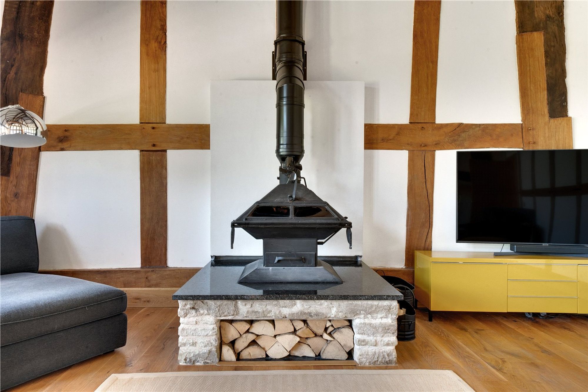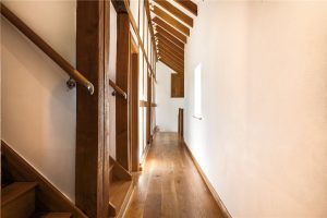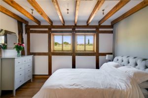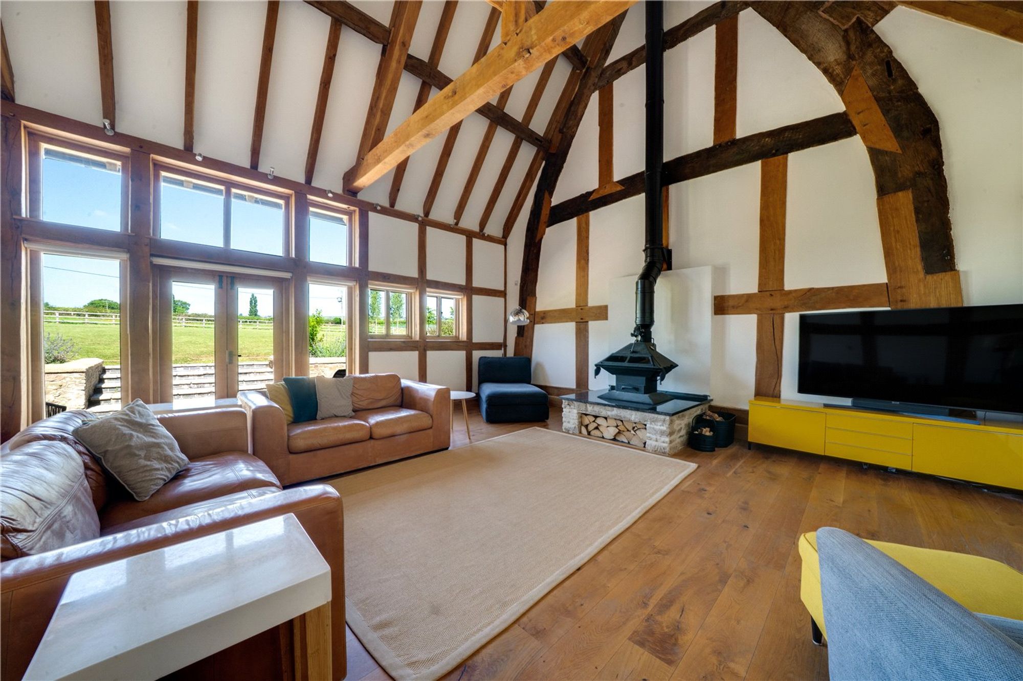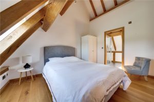 Located just off the kitchen is a reception room, which is currently used as a snug, with double doors opening out onto the patio area. The living room is a magnificent space, with character beams, an impressive vaulted ceiling and a wall of windows framing the countryside views. Double doors open out from here to the garden. A suspended wood-burning stove set on a stone plinth creates a striking focal point and enhances the room’s warm, rustic character.