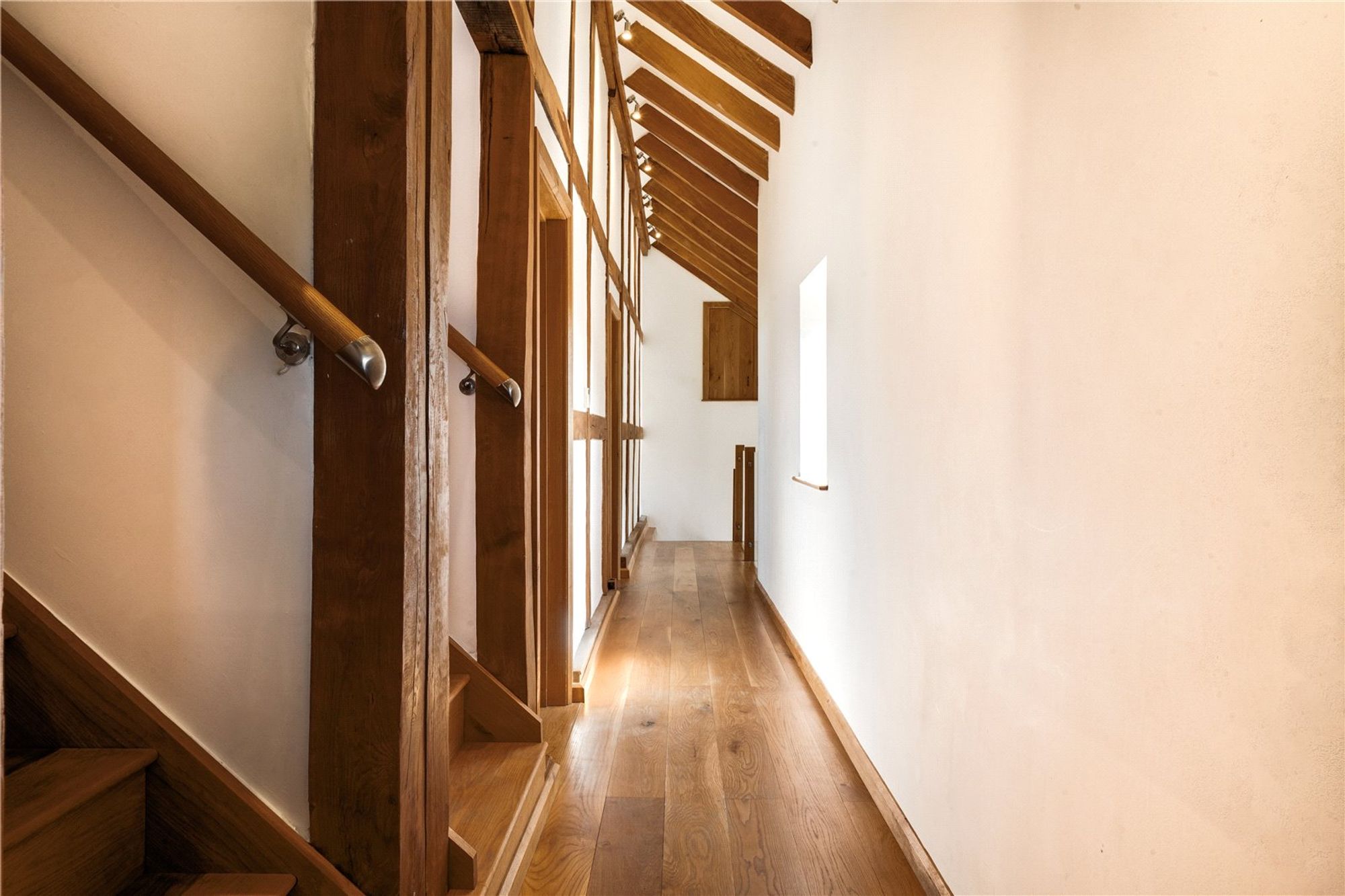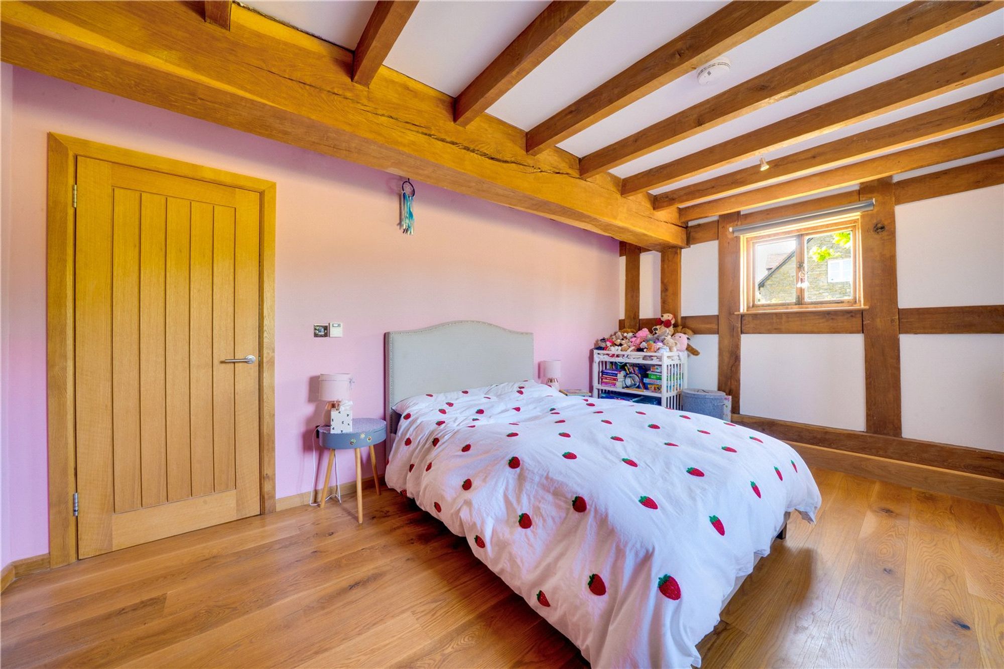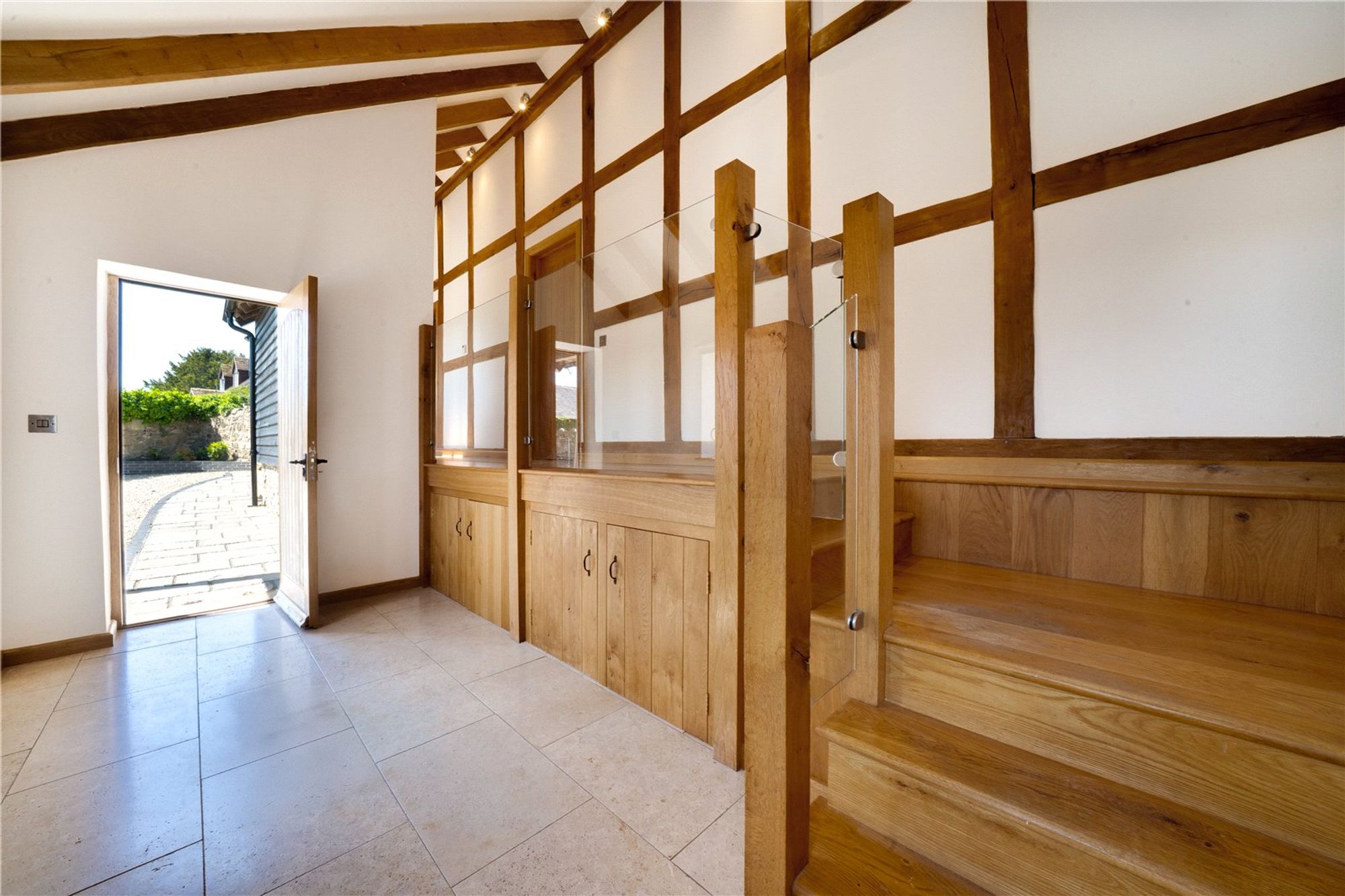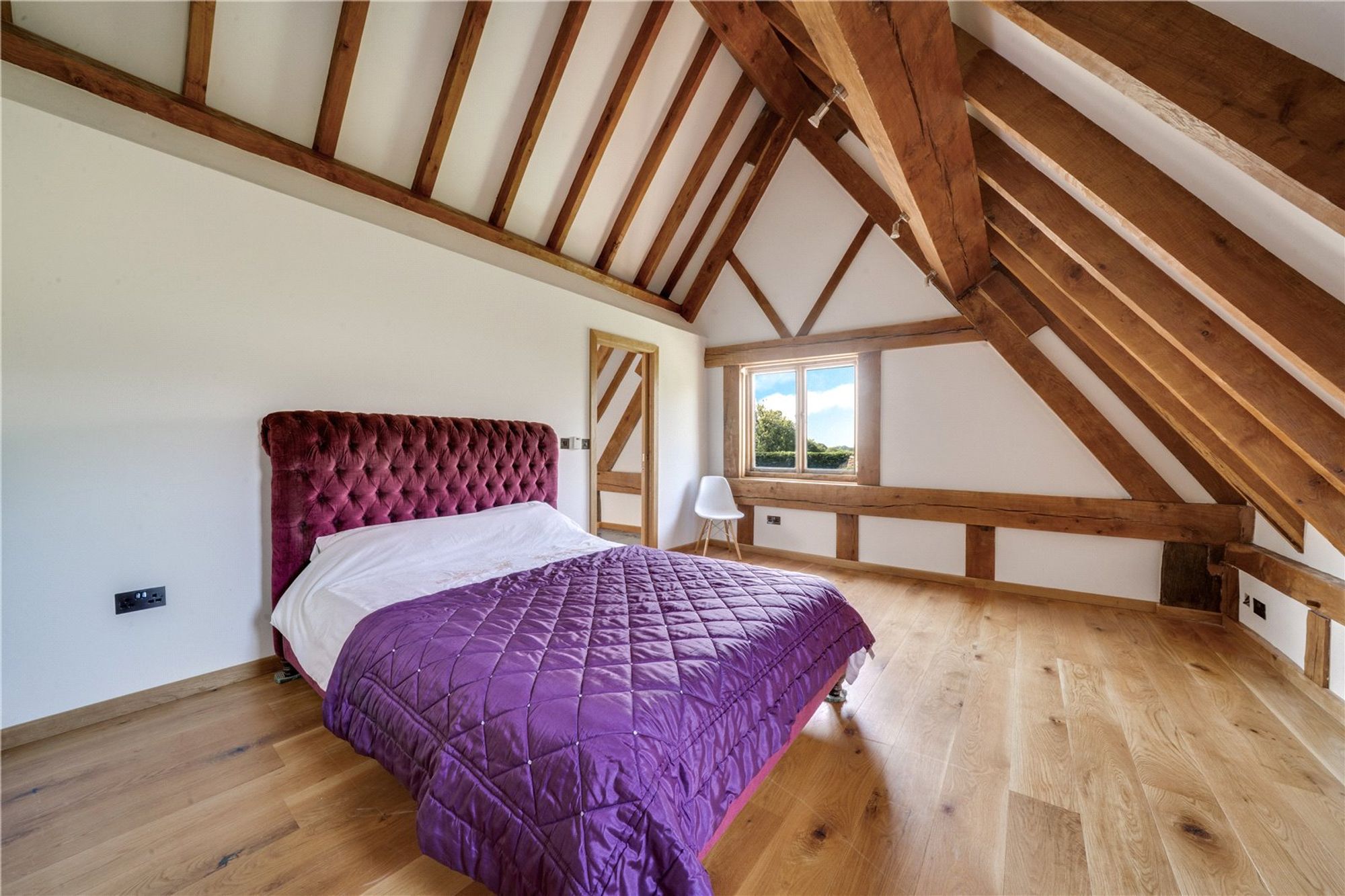 The main house is beautifully appointed with character features throughout including exposed timbers, vaulted ceilings, and oak flooring. The layout is thoughtfully designed for family living, complemented by stylish interiors and high-end finishes.