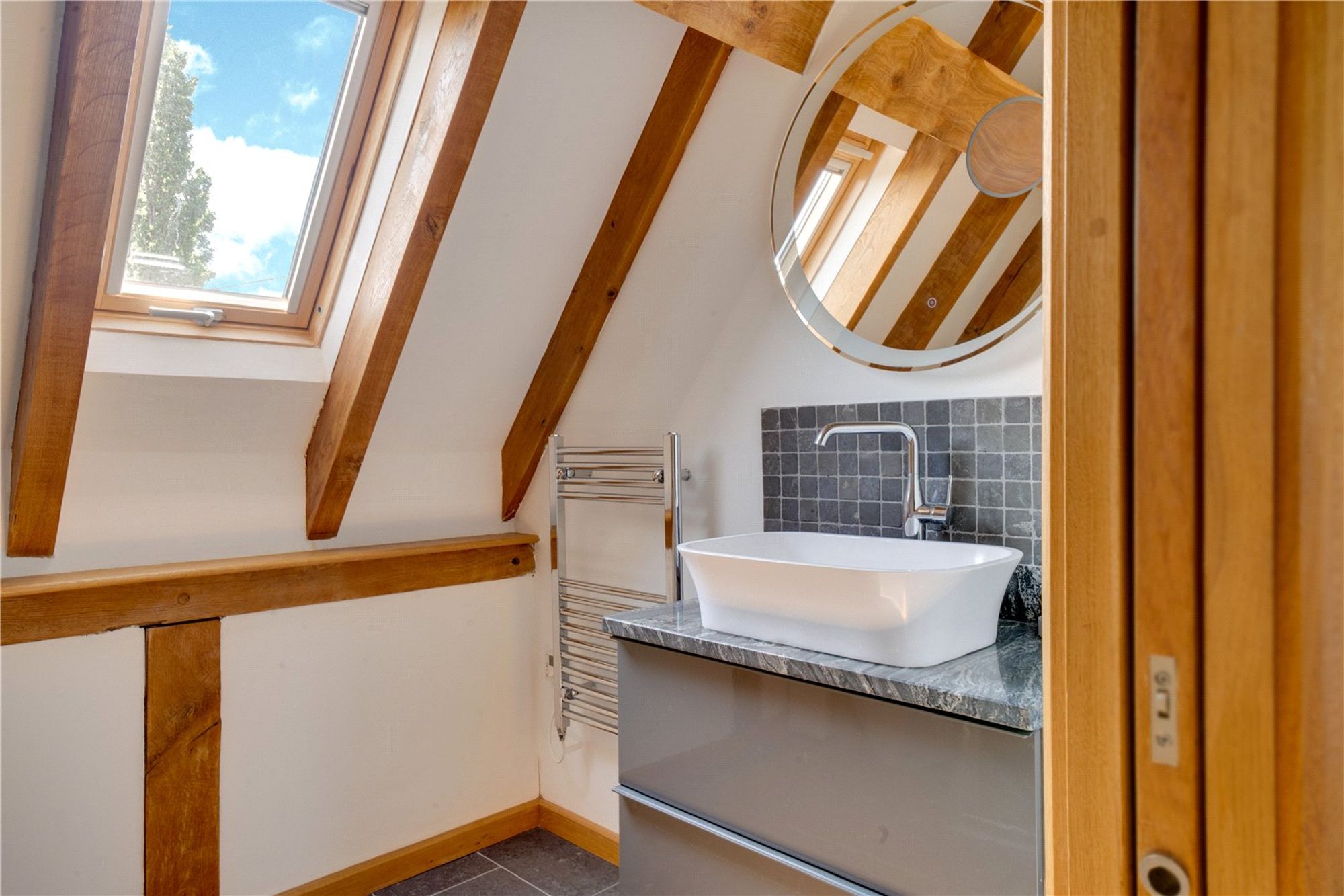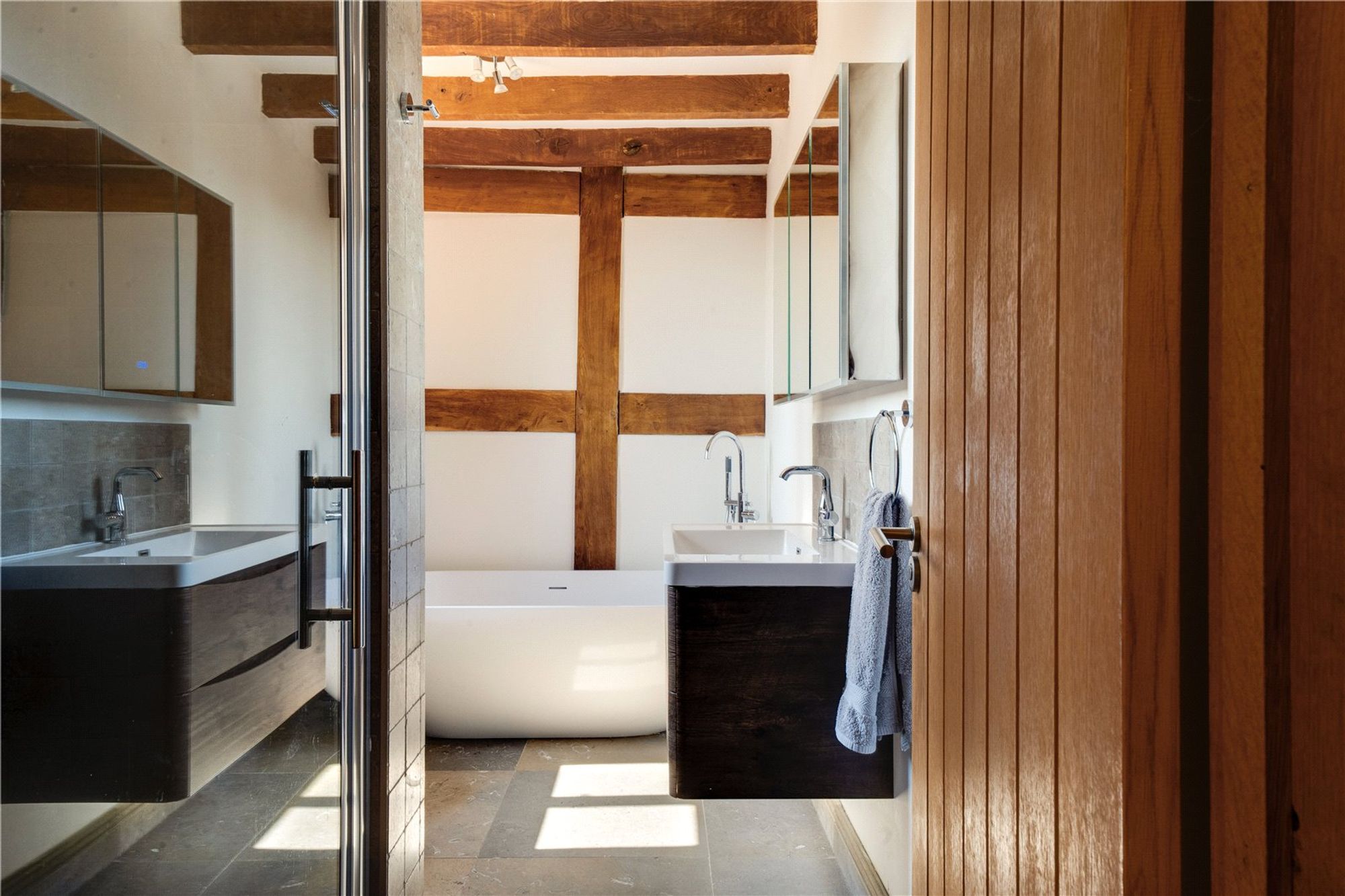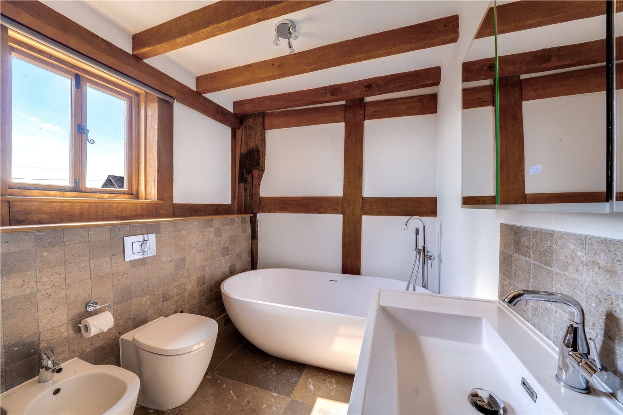 From the hallway there are two generous sized double bedrooms, both offer attractive oak floors, timber-framed walls and views over the surrounding fields. A family bathroom with a freestanding bath, walk-in shower, bidet, WC and wash hand basin serves these bedrooms.