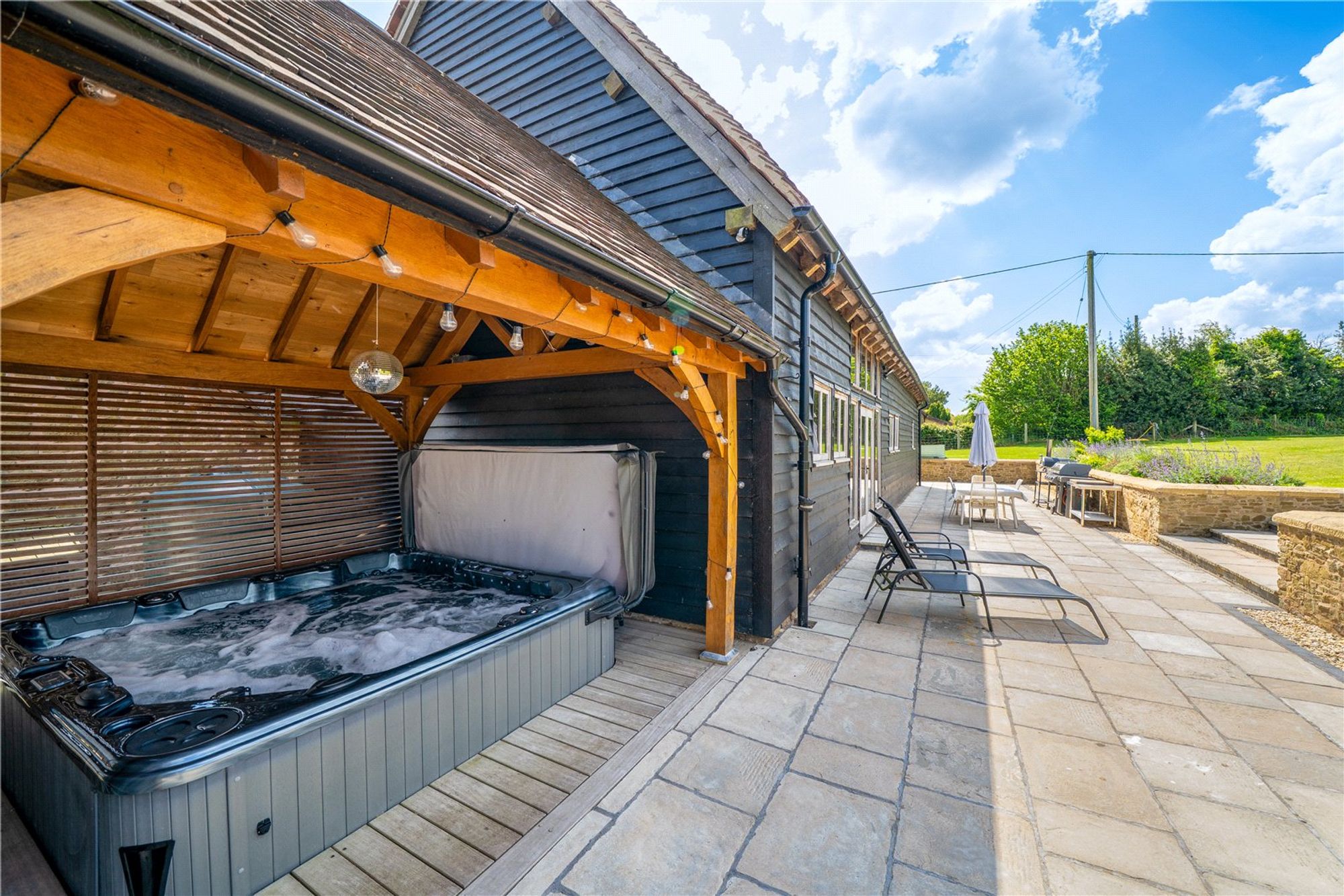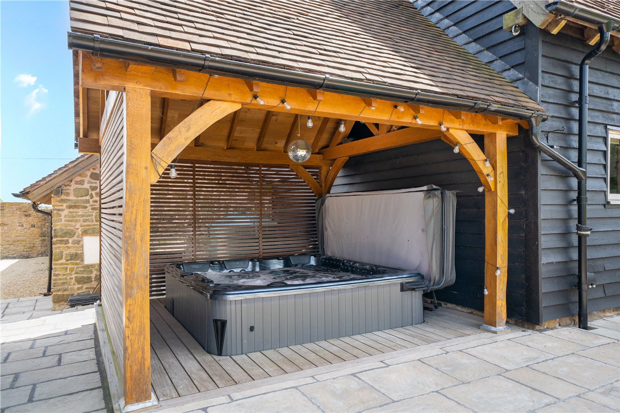 To one end of Cruck Barn is a covered outdoor hot tub area with Oak frame and tiled roof, adding to the entertainment space at the rear of the property.