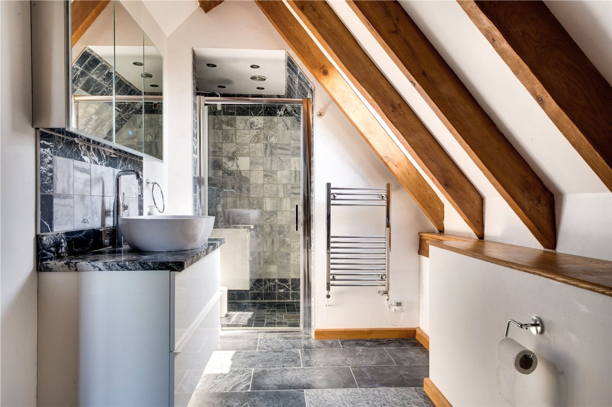 Upstairs there are two spacious bedroom suites, each enjoying the benefit of en suite shower rooms. The principal bedroom boasts character beams, vaulted ceiling and countryside views. The second bedroom also benefits from character beams and a light, peaceful atmosphere.