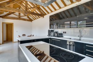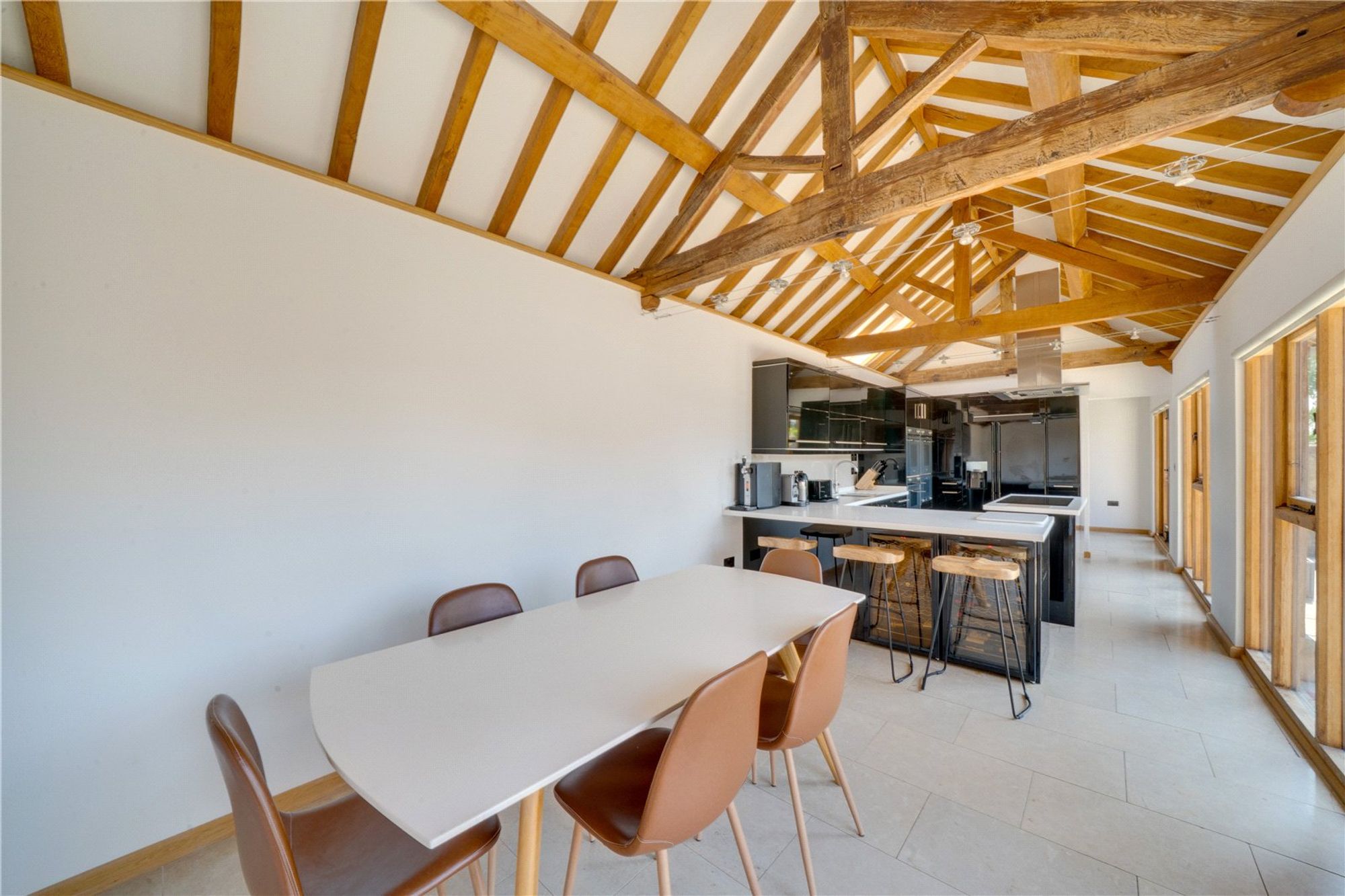 The real heart of the home is the open-plan kitchen/breakfast room. There are superb features including a vaulted ceiling with exposed beams and trusses and ample natural light coming in from the three sets of full height timber-framed windows, including one set of double doors opening out onto the patio area beyond.