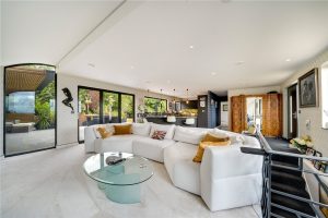 At the centre lies the magnificent open-plan living, dining, and kitchen space. Designed for both sociability and refinement, this light-filled area is bathed in sunshine through floor-to-ceiling acoustic windows and expansive bi-fold doors that open seamlessly onto a grand terrace with covered seating – an all-season haven for entertaining. The kitchen is a showcase of culinary luxury, boasting solid marble worktops and splashbacks, a “Billi” instant boiling water tap, premium integrated “Miele” appliances, and a “Samsung” smart fridge – every detail carefully curated to balance beauty with performance.