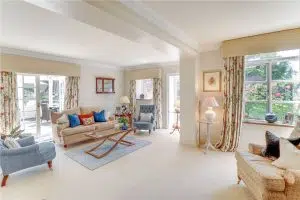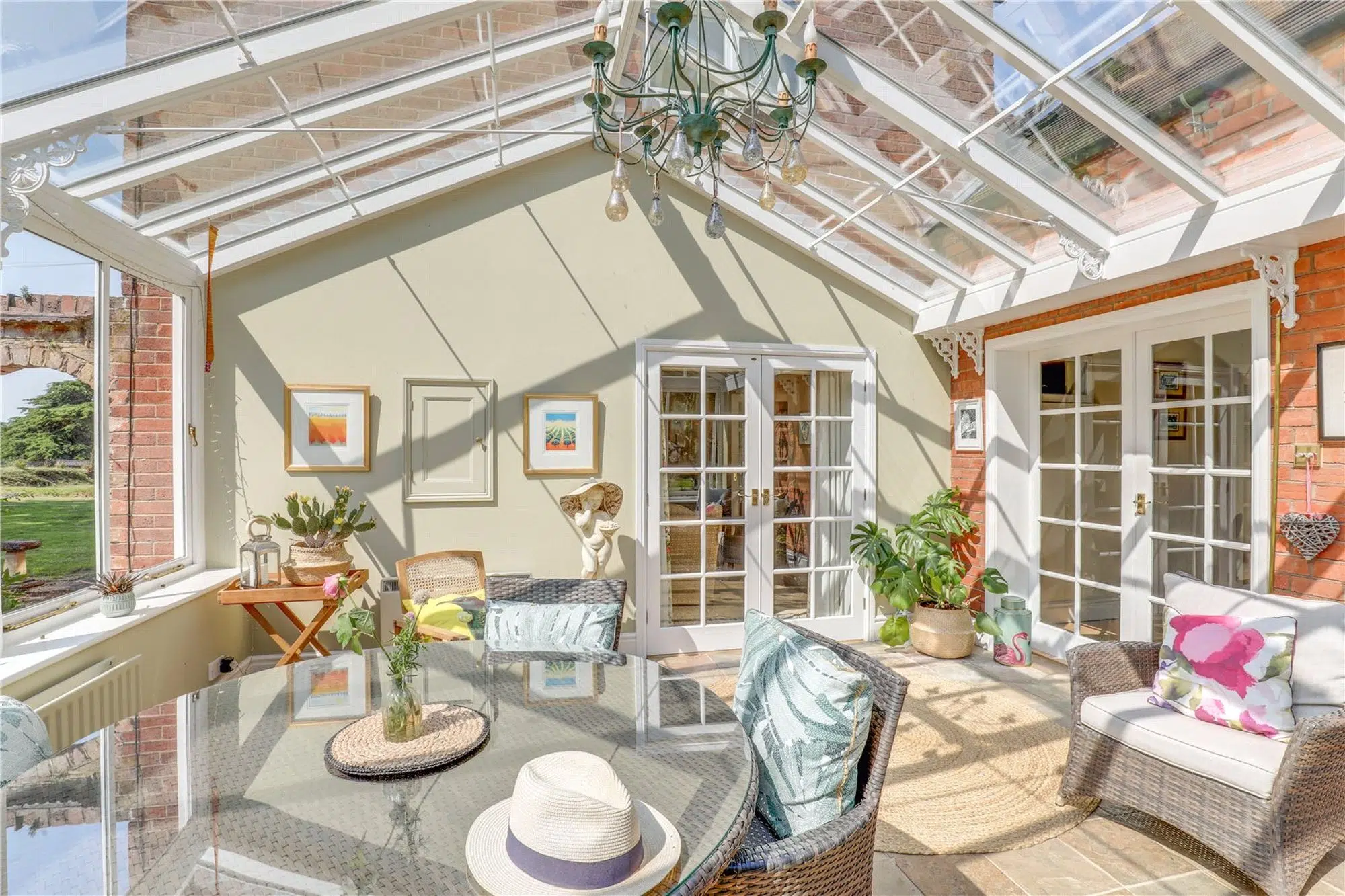 The gardens envelope the house on three sides, enhanced by a private wooded backdrop. The gardens are mainly laid to with a variety of mature trees and hedges. There are two large patio terraces, ideal for following the sun as it moves from one side of the garden to the other. One of the patio areas can be accessed directly from the orangery, ideal for entertaining and al fresco dining.