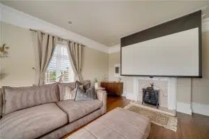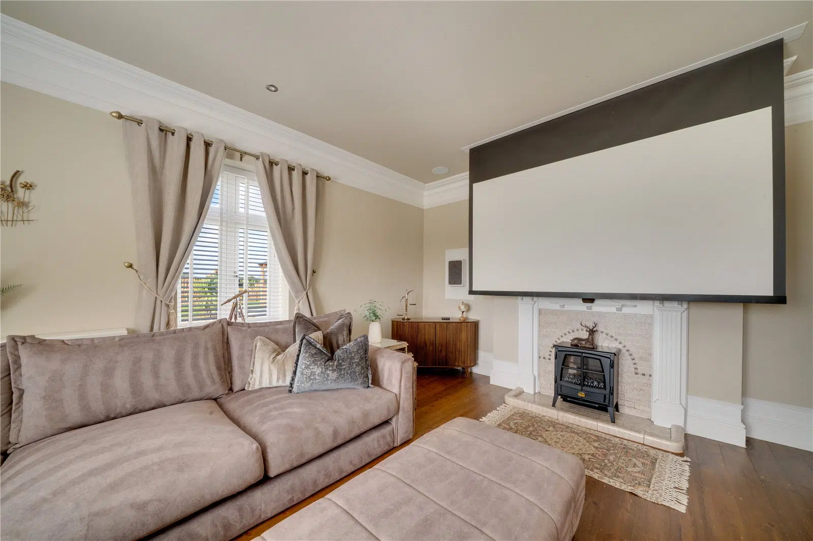 A separate dining room offers a spectacular setting for entertaining, with an enormous dining table, dedicated bar area, twin bottle fridges, and a wine chiller—perfect for celebratory feasts. The light-filled lounge provides garden views and doubles as a cinema room, complete with projector, drop-down screen, and an electric fire for cosy evenings.